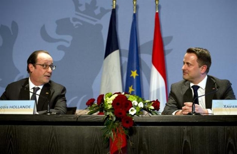 | Le président français Francois Hollande (gauche) et le Premier ministre luxembourgeois Xavier Bettel, à Luxembourg le 6 mars. |
