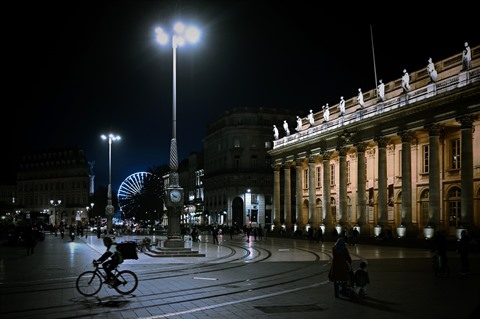| Un livreur de nourriture à vélo passe devant le Grand Théâtre à Bordeaux, dans le Sud-Ouest de la France, le 29 octobre, avant la mise en place du deuxième confinement national dans le pays. |