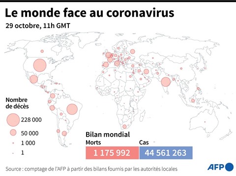 Dans le monde, la pandémie a contaminé plus de 44,5 millions de personnes, pour plus de 1,175 million de morts depuis fin décembre, selon un bilan établi par l'AFP jeudi 29 octobre.