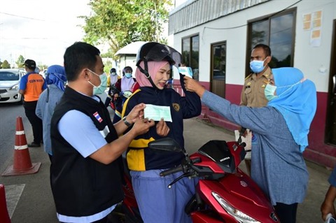 | Une femme se fait contrôler sa température dans la province de Narathiwat, dans le Sud de la Thaïlande, le 29 décembre |