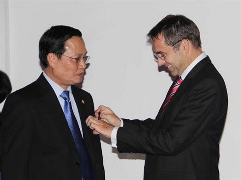 | L’ambassadeur de France au Vietnam, Jean-Noël Poirier, a remis jeudi soir 23 octobre à Hanoi l’ordre des palmes académiques au Professeur Nguyên Huu Duc, vice-doyen de l’Université nationale de Hanoi. |