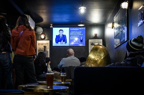 | Les clients d'un bar de Bordeaux (Sud-Ouest) suivent l'allocution télévisée du président Macron annonçant un reconfinement en France, le 28 octobre. |