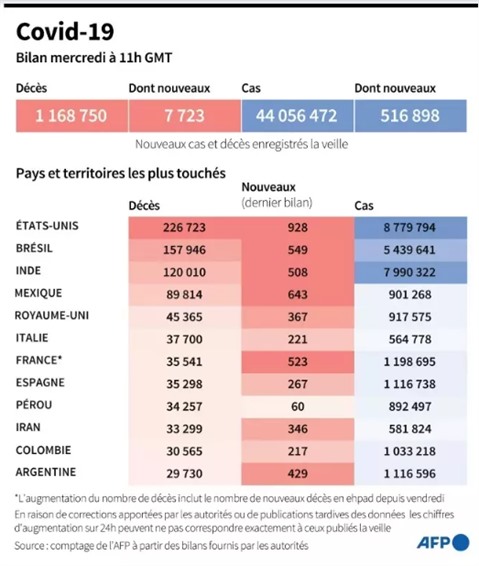 Plus de 44.056.470 cas d'infections ont été officiellement diagnostiqués.