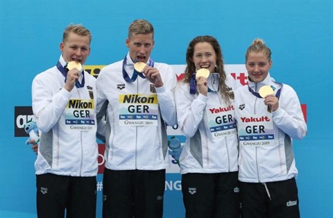 Les nageurs allemands célèbrent leur victoire au relais mixte 5 km des championnats du monde de natation de Yeosu, en R. de Corée. Photo: AFP/VNA/CVN |