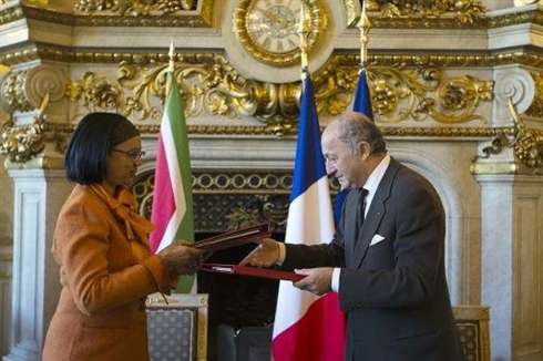 | Le ministre français des Affaires étrangères Laurent Fabius et la ministre sud-africaine de l'Énergie Tina Joemat-Petterson signent un accord à Paris le 14 octobre. |