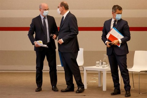 | De gauche à droite : le ministre de l'Éducation, Jean-Michel Blanquer, le Premier ministre Jean Castex et le ministre de l'Intérieur, Gerald Darmanin, avant la conférence de presse du 22 avril, à Paris. |