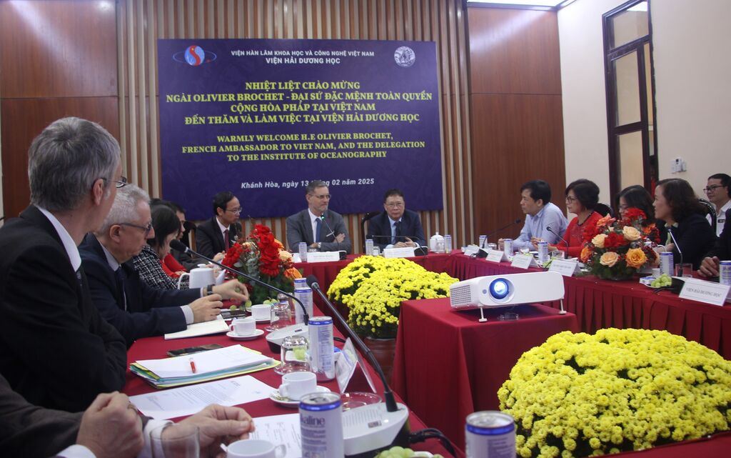 | Séance de travail entre l'ambassadeur de France au Vietnam, Olivier Brochet, et l'Institut d'océanographie de l'Académie des sciences et technologies du Vietnam, le 13 février dans la province de Khanh Hòa (Centre). |