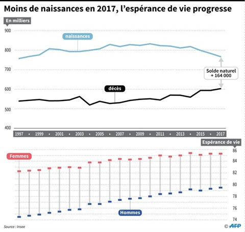 | Graphique sur la démographie française en 2017, évolution du nombre de naissances et de l'espérance de vie. |