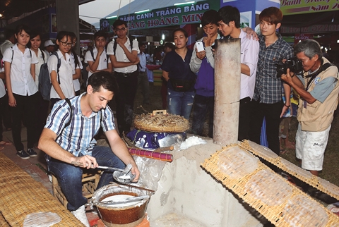 | Un touriste étranger apprend à fabriquer une galette de riz. |