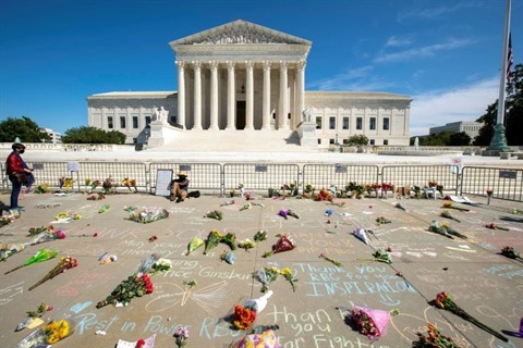 | Des fleurs sont déposées devant la Cour suprême américaine, à Washington, le 19 septembre 2020. |