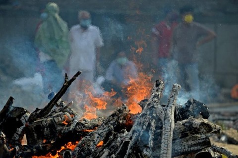 | Des buchets funéraires de victimes mortes du COVID-19 à New Delhi, le 12 mai. |