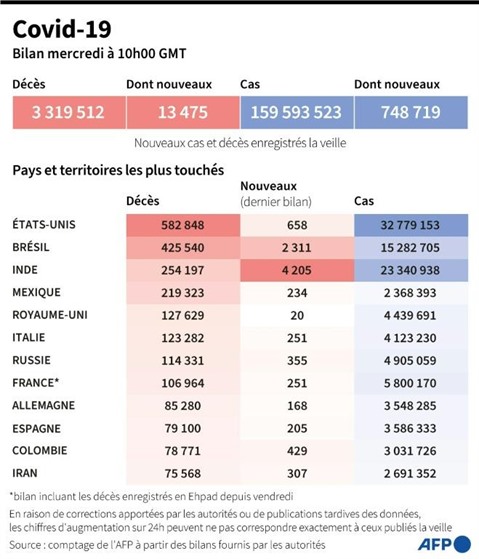 Alors que les progrès de la vaccination permettent d'envisager un progressif retour à la normale en Amérique et en Europe, l'Inde a déploré 4.200 décès en 24 heures, 250.000 au total, aux prises avec un variant qui s'est étendu à au moins 44 autres pays.