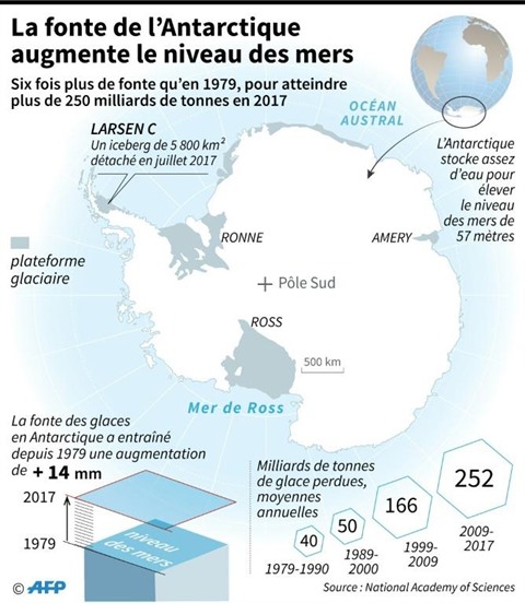 L'amoindrissement des glaces du Continent Blanc est responsable d'une montée de 1,4 centimètre du niveau des océans de la planète entre 1979 et 2017, selon un rapport des Compte-rendus de l'Académie américaine des sciences (PNAS). Et le rythme de fonte anticipé devrait entraîner une élévation désastreuse de ce niveau dans les prochaines années, a relevé Eric Rignot, président de la chaire de système scientifique de la Terre à l'université de Californie (Irvine).