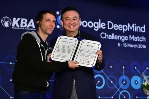 | Hong Seok-Hyun (droite), président de Korea Baduk, qui supervise les joueurs de Go en Corée du Sud, remet une "neuvième dan" pour Alpha Go à David Silver, chef du groupe de recherche sur l'apprentissage chez Google Deepmind, à Séoul, le 15 mars. |