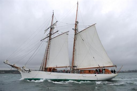 Le navire s'élance élégamment dans la rade de Brest, dans une mer agitée, avec ses 16 membres d'équipage et ses douze passagers, dont une peintre, une photographe et une infirmière de la marine, ainsi que trois élèves officiers danois.