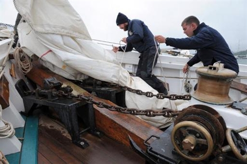 | Deux marins à la manœuvre, le 18 mai, sur la goélette de la Marine, l'Étoile, en partance pour un périple de trois mois au-delà du cercle polaire. |