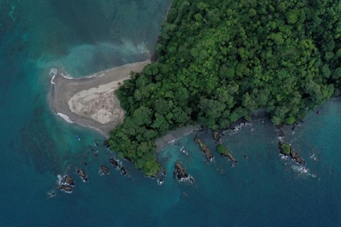 | Vue aérienne de l'île de Gorgone, où se trouvait autrefois une prison, dans l'océan Pacifique au large du sud-ouest de la Colombie, le 1er décembre 2021. |