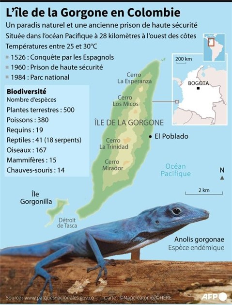 | Localisation de l'île de la Gorgone en Colombie et quelques chiffres sur sa biodiversité. |