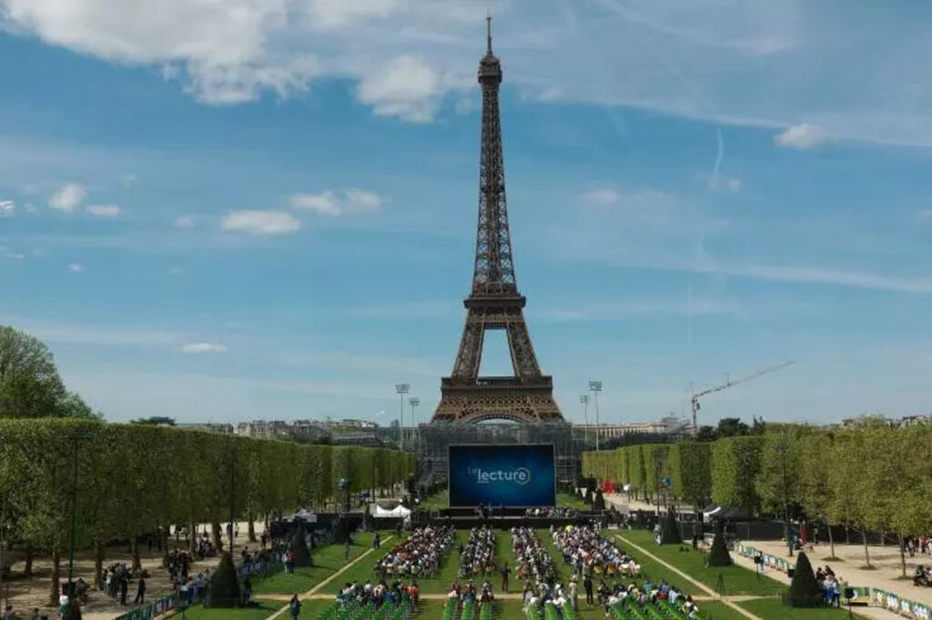 Les participants de tous âges étaient rassemblés près du Grand Palais éphémère, où a lieu jusqu'à dimanche 14 avril le Festival du livre de Paris, pour participer à cette "Grande dictée des Jeux olympiques", où le célèbre Champ de Mars remplace les murs de la salle de classe et la Dame de fer le tableau noir.