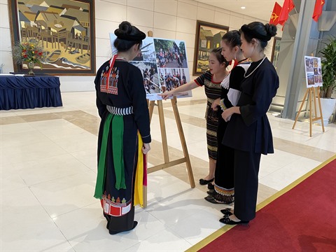 | Visiteurs à l’exposition de photos sur les groupes ethniques du Vietnam. |