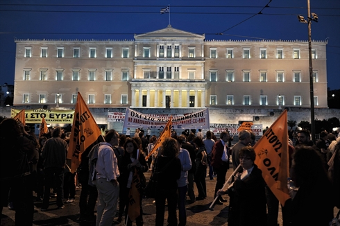 | Manifestation devant du Parlement à Athènes, le 28 avril |