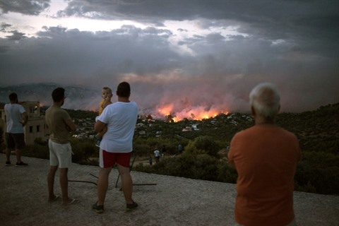 | Des Grecs observent un feu de forêt à Rafina dans la banlieue d'Athènes, le 23 juillet. |