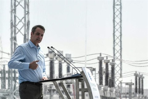 | Le Premier ministre grec Kyriakos Mitsotakis lors de l'inauguration d'un parc éolien dans le village de Vilera, dans le Nord de la Grèce, le 6 avril. |