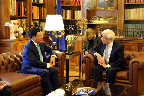 | Le vice-Premier ministre vietnamien et ministre des Affaires étrangères, Pham Binh Minh (gauche), reçu par le président grec Prokopis Pavlopoulos le 2 juillet. |