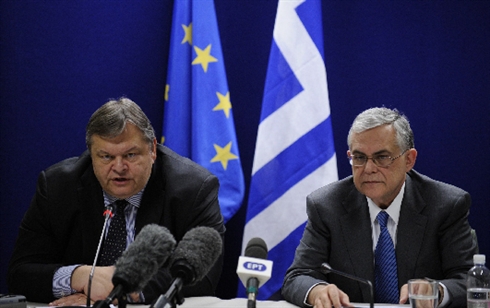 | Le ministre grec des Finances, Evangelos Venizelos (gauche), et le Premier ministre Lucas Papademaos lors d’une conférence de presse le 21 février à Bruxelles. |