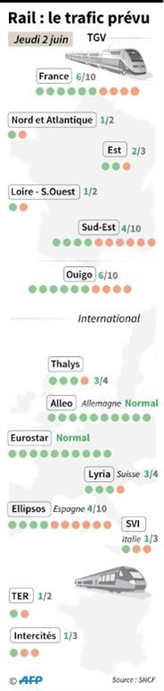 Côté ciel, le trafic sera légèrement perturbé le 2 juin, notamment à Orly et Lille où Air France a annulé 10% des vols, en raison d'une grève des contrôleurs aériens répondant à un appel de la CGT-fonction publique contre "l'inacceptable" loi travail.