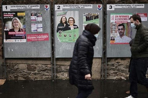 | Des piétons passent devant des affiches électorales à Paris, où des élections législatives partielles, prévues les 4 et 11 avril, ont été reportées par les autorités à cause de la pandémie de COVID-19, le 25 mars. |