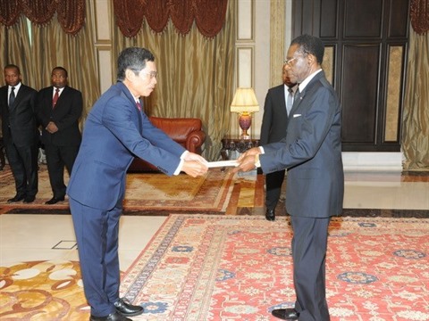 | L’ambassadeur vietnamien Nguyên Manh Cuong (gauche) présente ses lettres de créance au président de Guinée équatoriale O. N Mbasogo. |