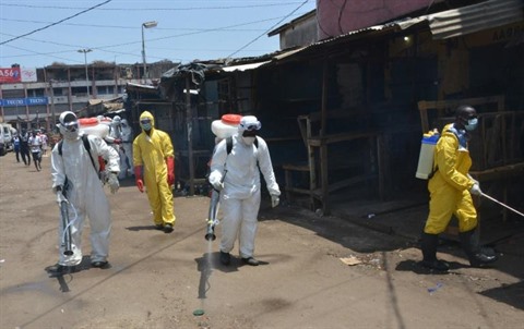 | Des employés en combinaison de protection désinfectent les rues et les échoppes pendant l'épidémie de coronavirus, le 12 avril à Conakry, en Guinée. |