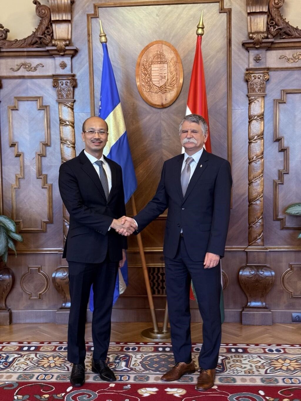 | Le président de l’Assemblée nationale de Hongrie, László Kövér, recevant l’ambassadeur du Vietnam en Hongrie, Bùi Lê Thai. |