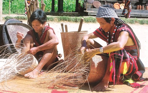 | Hommes Co Tu tressant des hottes traditionnelles. |