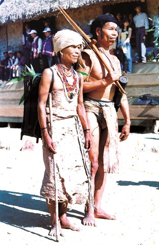 | Le patriache Tongol Oi du hameau de Công Dô et ses hottes. |
