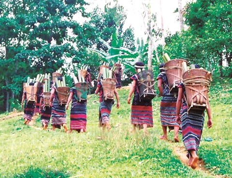 | Les femmes Co Tu portent souvent des hottes quand elles vont à la rizière. |