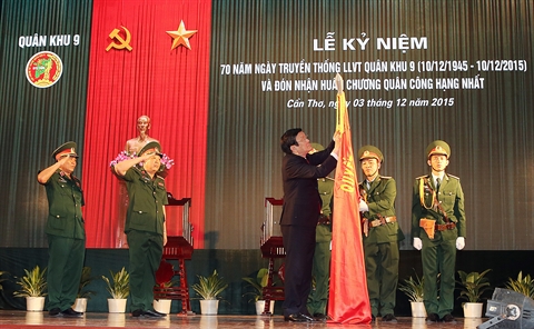| Truong Tân Sang remet l'Ordre du Mérite militaire de 1re classe à la IXe Zone militaire, le 3 décembre, à Cân Tho. |
