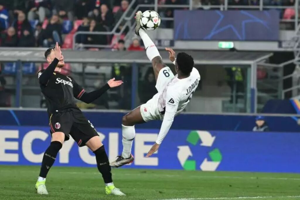 | Le Canadien du LOSC l'attaquant Jonathan David tente un ciseau lors du match de C1 contre Bologne le 27 novembre dans le stade Renato Dall'Ara en Italie. |