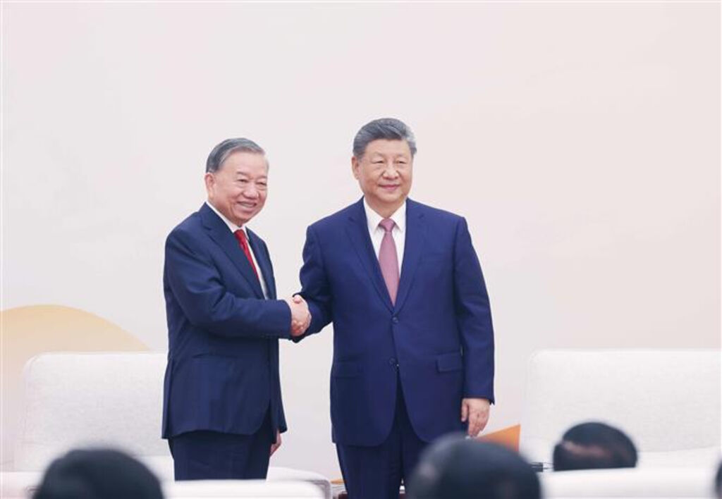 | Le secrétaire général du Comité central du Parti communiste du Vietnam et président vietnamien Tô Lâm (gauche) et le secrétaire général du CC du Parti communiste chinois et président chinois, Xi Jinping. |