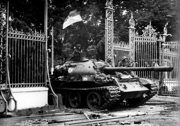 | Le 30 avril 1975 à 11h30, un char de l’Armée vietnamienne détruit les principales portes du Palais présidentiel, dernier bastion du régime de Saïgon, mettant ainsi un terme à une guerre de 30 ans. |