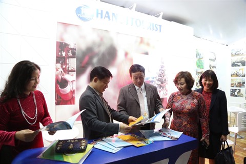 | Des autorités de la municipalité de Hanoï rendent visite aux stands lors de la Journée de promotion du tourisme, le 1er novembre au jardin de fleurs de Ly Thai Tô. |