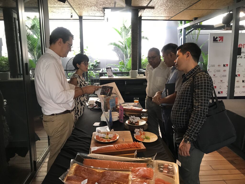 | Le chef Sakal Phoeung présente une démonstration culinaire avec du saumon français Pure Salmon aux participants. |