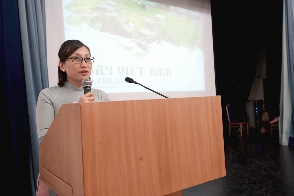 | Mai Nguyên Tuyêt Hoa, première secrétaire chargée de l'éducation de l'ambassade du Vietnam en Russie, prend la parole lors de l'événement à Moscou. Photo : VNA/CVN |