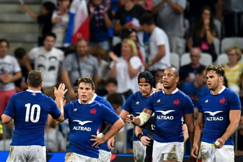 | Des joueurs du XV de France après leur victoire contre l'Écosse, le 17 août à Nice. |