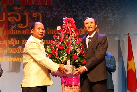 | Le ministre lao de la Police, Somkeo Silavong (gauche), offre une corbeille de fleurs au représentant du ministère vietnamien de |