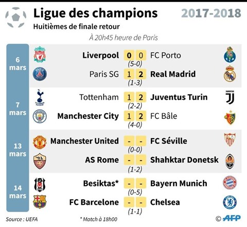 Chelsea et le FC Barcelone batailleront mercredi prochain au Camp Nou après leur nul de l'aller (1-1), comme Manchester United et Séville qui s'affrontent en Angleterre mardi 5 mars (0-0 à l'aller). Le Bayern n'a plus qu'à valider son ticket contre Besiktas mercredi 7 mars (5-0 à l'aller à Munich), tandis que la veille, l'AS Rome devra renverser le Shakhtar Donetsk après avoir souffert en Ukraine (2-1).