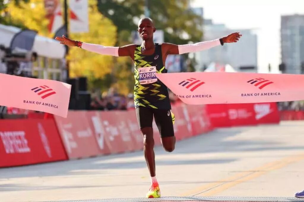 | John Korir du Kenya célèbre sa victoire sur la ligne d'arrivée du Marathon de Chicago 2024, le 13 octobre. |