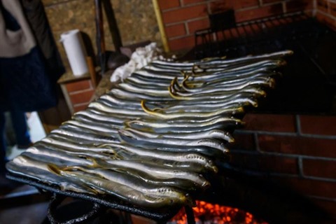 | Des lamproies prêtes à être grillées lors du festival de la lamproie, le 9 octobre à Slacgriva, en Lettonie. |