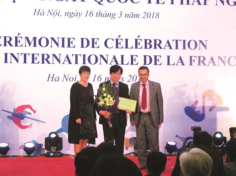 | Le Professeur Trinh Van Minh (centre) reçoit en mars le Prix d’Honneur du Groupe des ambassades, délégations et institutions francophones au Vietnam. |